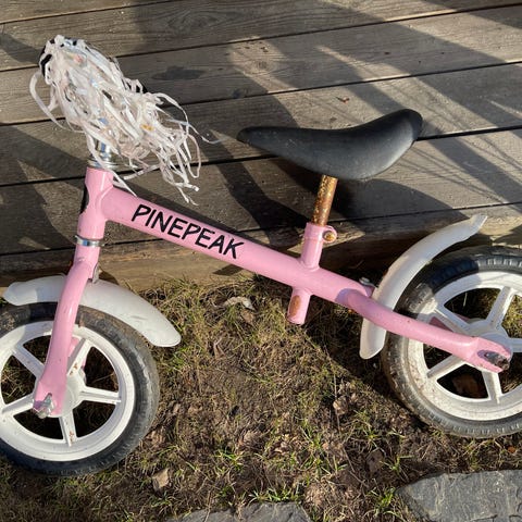 Paljon käytetty, mutta ehjä ja edelleen toimiva potkupyörä pienelle lapselle. Satula säädettävissä.