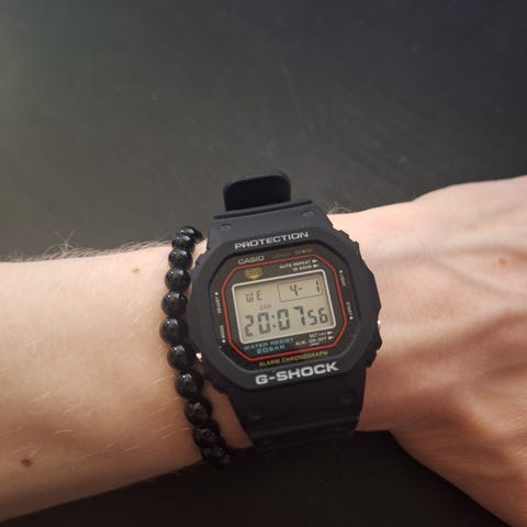 Casio G-Shock miesten rannekello. Kellossa on musta ranneke ja kultasävyinen kuori. Taulu on tumma ja siinä on analoginen näyttö. Takakannen merkintöjen mukaan kello on iskun- ja vedenkestävä (200 m), ja siinä on ruostumattomasta teräksestä valmistettu takakansi. Sopii miehille jokapäiväiseen käyttöön ja ulkoiluun. Lisätietoja pyytäessä. Ovh ~ 230 €.
