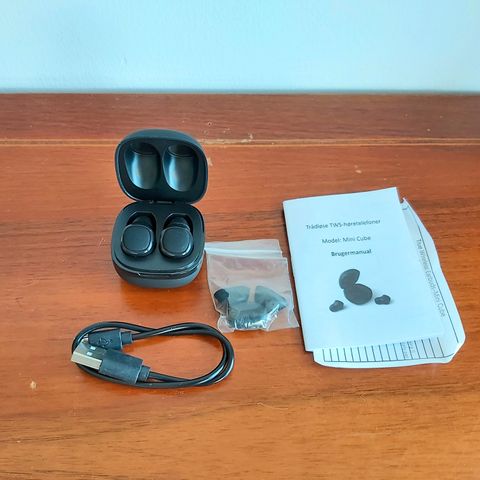 Tison langattomat kuulokkeet. Mustat. Latauskotelo, latausjohto ja 6 paria kumisia korvanappeja mukana. Akunkesto kuulokkeissa 6h täydellä latauksella, latauskotelolla 40h.
