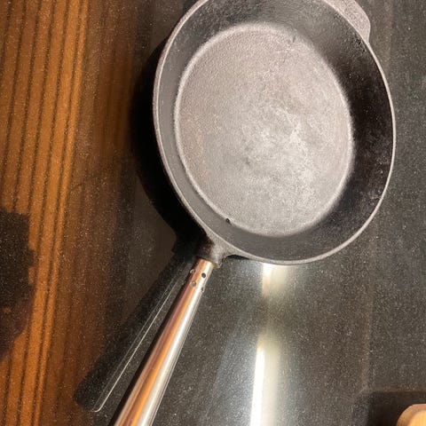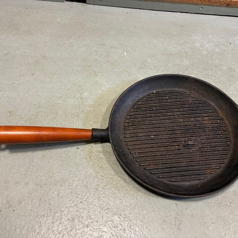 Jonkun kerran käytetty, mutta ehjä pannu. Hyvä, suora ja paksupohjainen