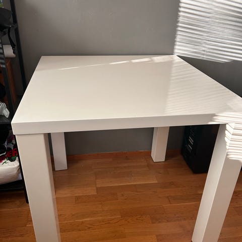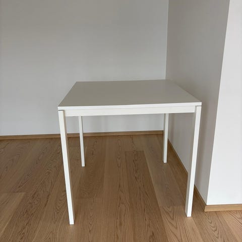 IKEA ruokapöytä ja tuolit, väri musta. Pöytä on suorakaiteen muotoinen ja sopii pieneen keittiöön tai ruokailutilaan. Mukana useita saman sarjan tuoleja. Materiaali vaikuttaa olevan puu- tai puukuitulevyä sekä muovia. Soveltuu arki- ja työskentelypöydäksi esimerkiksi kerrostaloasuntoon tai pieneen tilaan.