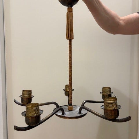 Erittäin hyväkuntoinen antiikkimessinnginvärinen, viisihaarainen kattokruunu, jossa on lasikuvut.