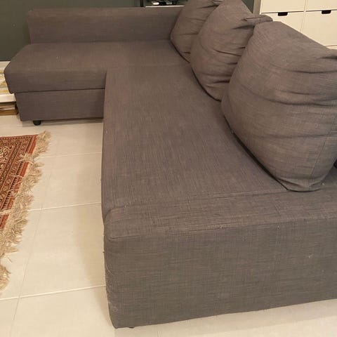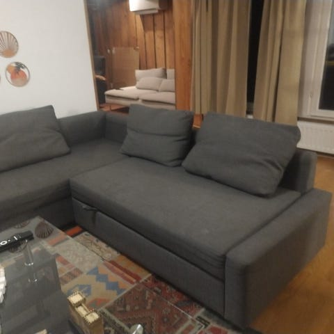 IKEA Friheten kulmavuodesohva tummanharmaa. Kulmasohva divaanilla joka muuntuu vuoteeksi ja jossa on säilytystilaa istuinosan alla. Selkänojassa irrotettavat selkätyynyt. Yhdessä kuvassa näkyy vaurioitunut kulma, josta kangas on revennyt ja pehmuste on näkyvissä. Ei näy kuin sohvaa kootessa.