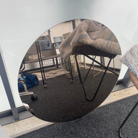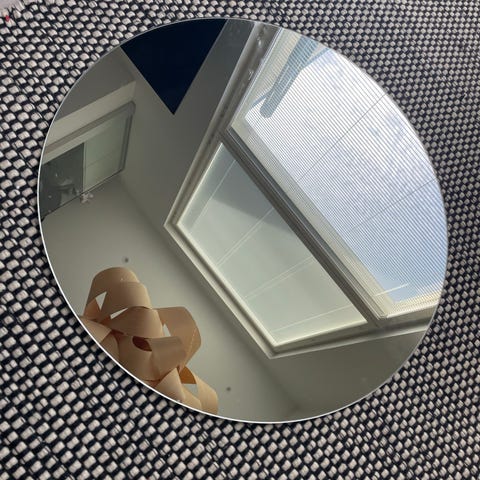 Jysk pyöreä peili metallikehyksellä. Peilissä on kapea, vaaleasävyinen metallireunus. Sopii käytettäväksi esimerkiksi makuuhuoneessa, eteisessä tai olohuoneessa seinäpeilinä tai lattialle nojaavana peilinä sisustuksen osana.