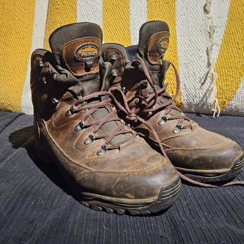 Meindl vaelluskengät, koko 44,5. Korkeavartiset ruskeat nahkaiset kengät.