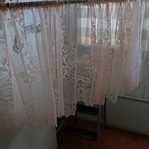 Pitsiverho settejä erillisiä kappoja tankokujalla, yhdessä kapassa on kukka-aiheinen painokuvio värillisissä ruukuissa, reunassa sydänkuvioinen reikälista ripustusta varten, mukana on valkoisia pitsiverhoja kukkakuvioilla sekä valkoinen pitsikappa, jossa on lintuaiheinen kuvio, vaaleanpunainen kukkakuvioinnilla.