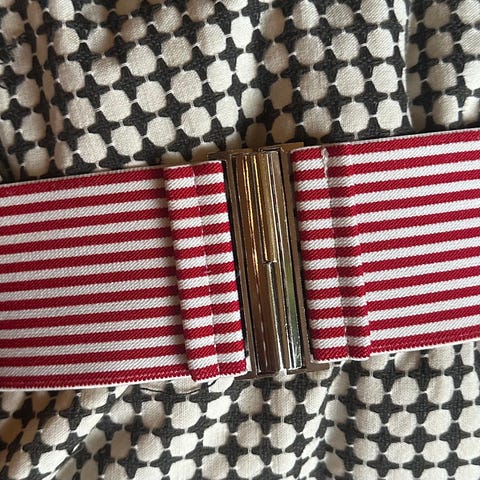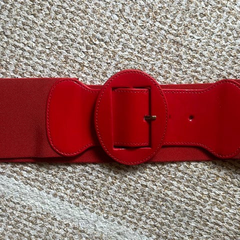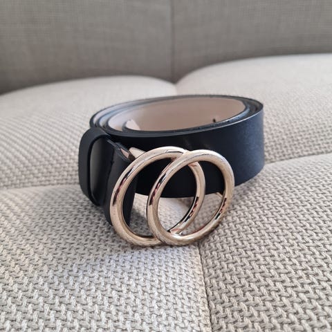Naisten musta vyö, jossa leveä malli ja suuri suorakulmainen solki. Joustava, solkikeinonahkaa. Koko n. Xs-s