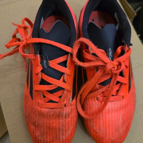 Adidas jalkapallokengät. Mustat nappulakengät, joissa hopeat kolme raitaa sivuilla ja nauhakiinnitys. Pohjassa useita keltaisia nappuloita, jotka on suunniteltu luonnonnurmelle tai keinonurmelle. Sopivat jalkapallon pelaamiseen.