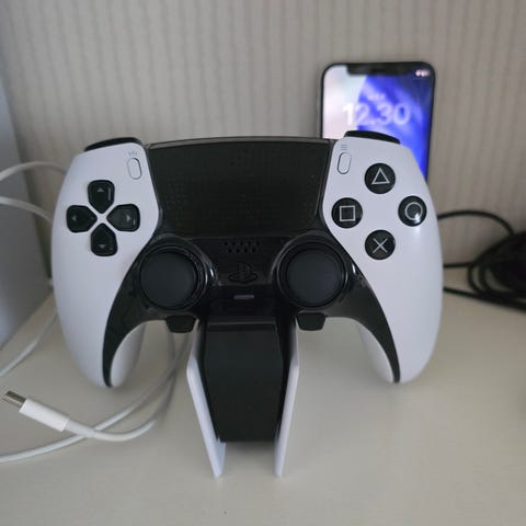 Sony DualSense Edge ohjain Playstation 5 -konsolille. Väri valkoinen mustilla yksityiskohdilla. Mukana kantokotelo ja vaihdettavia ohjaimen osia, kuten tatteja ja mahdollisia lisäpainikkeita. Sopii käytettäväksi PS5-konsolin kanssa pelaamiseen.
