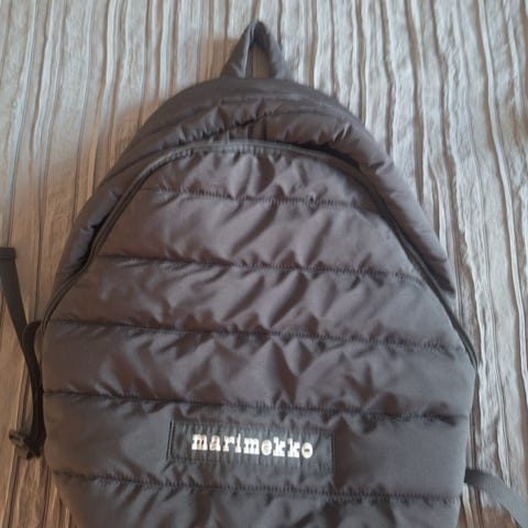 Marimekko Enni Sahalaitaraita mustavalkoinen reppu. Reppu on valmistettu paksusta 100 % puuvillamarkiisista. Repussa on säädettävät olkahihnat, vetoketjukiinnitys sekä sisäpuolella kaksi taskua, joista toisessa on vetoketju. Ulkopuolella on kaksi vetoketjutaskua, joista toinen on etupuolella ja toinen selkäpuolella, sisäpuolella on pehmustettu takaosasto.