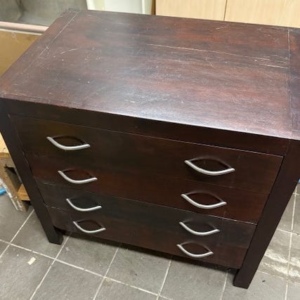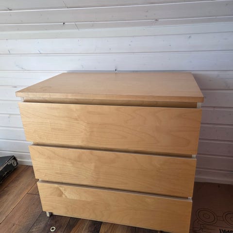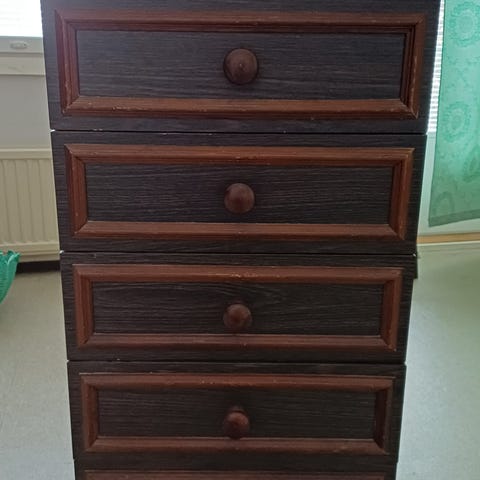 Kohtalaisessa kunnossa oleva lipasto. Kahdessa ensimmäisessä vetolaatikossa tahroja.