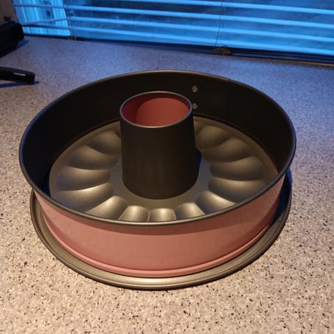 Hackman kakkuvuoka, materiaalina alumiini. Vuoka on kullanvärinen ja siinä on keskellä reikä, joka sopii esimerkiksi kuivakakkujen ja rengaskakkujen paistamiseen. Tilavuus 1,8 litraa
