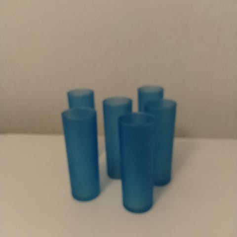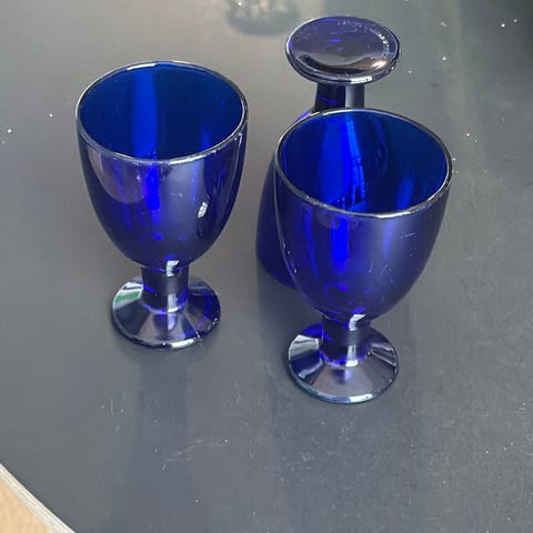 Siniset juomalasit, jääneet kaapin perälle lojumaan. Hyvässä kunnossa. 5kpl