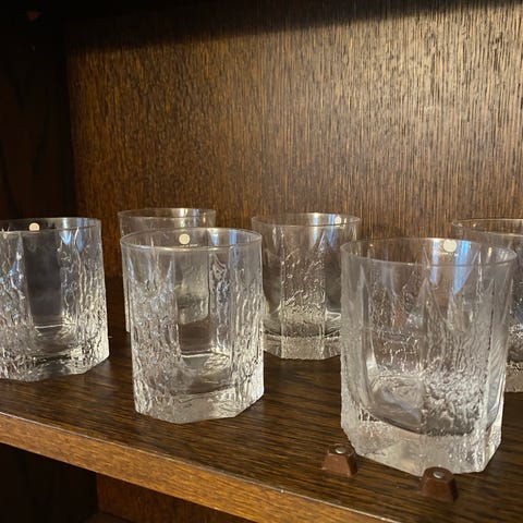 Iittala juomalasit kirkkaasta lasista, suunnittelija Timo Sarpaneva. Lasit ovat matalia ja paksupohjaisia, sopivat esimerkiksi veden, mehujen tai muiden juomien tarjoiluun. Yksittäin ostettuna 8 eur.
