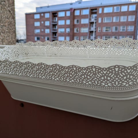Musta, metallinen kukkalaatikko, leveys 35cm, korkeus 45cm.