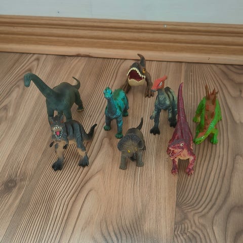 Käytetyssä kunnossa mutta edelleen uusiin seikkailuihin soveltuvat dinot uuteen kotiin. Ainoat huomautukset näkyvät kuvissa. Taisteluvammat; toisella hännästä puuttuu pala ja toisella etujalka poikki.