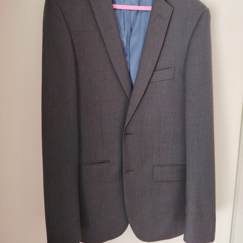 Tummanharmaa puku hyvässä kunnossa. Takki, housut ja kauluspaita. Ollut aikoinaan sopiva noin 171cm / 65kg pojalle.