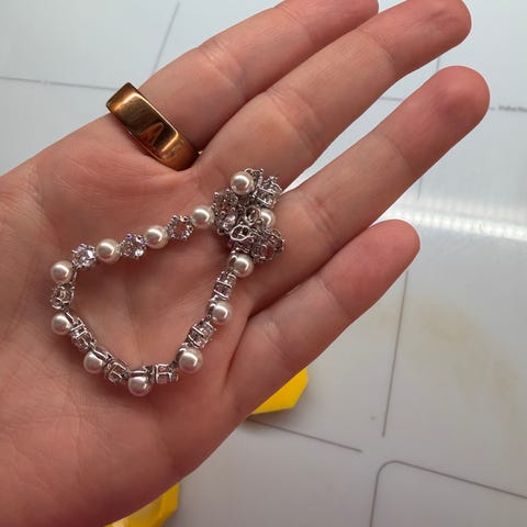 Helmiä ja kristalleja on korussa vuorotellen ja kattaen koko korun. Korun materiaalina on Swarovskin korumetalli ja se on rodinoitu kauniin vaaleaksi.
