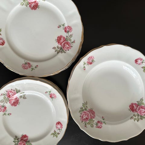Arabia lautaset, joissa valkoinen pohjaväri ja kukkakoriste. Lautasissa on reunoilla ruusukuviointi ja kapea reunuskoriste. Sopivat esimerkiksi kattaukseen ruokalautasina tai tarjoiluun. Pohjassa Arabian leima, Made in Finland.