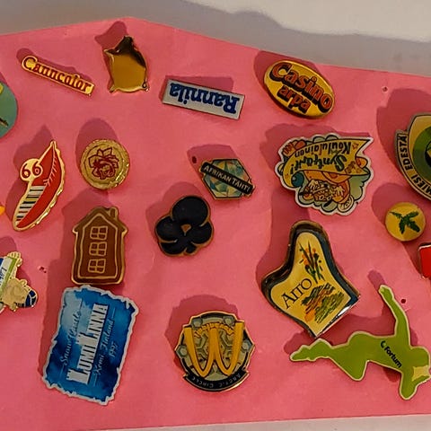 Kuvanmukaiset,vanhat matkamuisto pinssit.