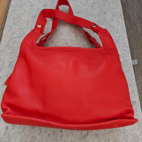 Lumi-olkalaukku on valmistettu punaisesta nahasta, jossa on kevyt pintakuviointi. Laukussa on hopeanvärinen ketjuhihna, joka toimii olkahihnana tai tuplattuna lyhyempänä. Pussimallinen laukku sulkeutuu vetoketjulla, ja etuosassa on tunnusomainen LUMI-logo.