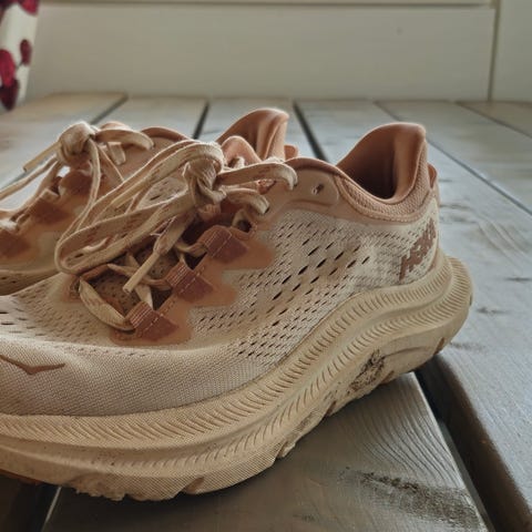Hoka Bondi 8 juoksukengät koossa 38. Kengillä kävelty n. 5km. Oikean jalan kenkä olikin liian nafti juoksuun.