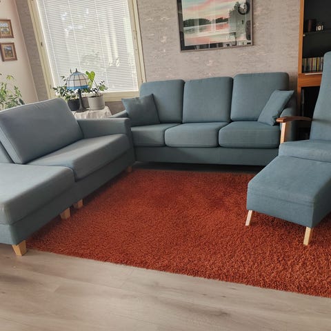 Hyväkuntoinen sohvakalusto, puuverhoilua ryhmässä.