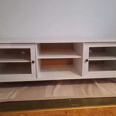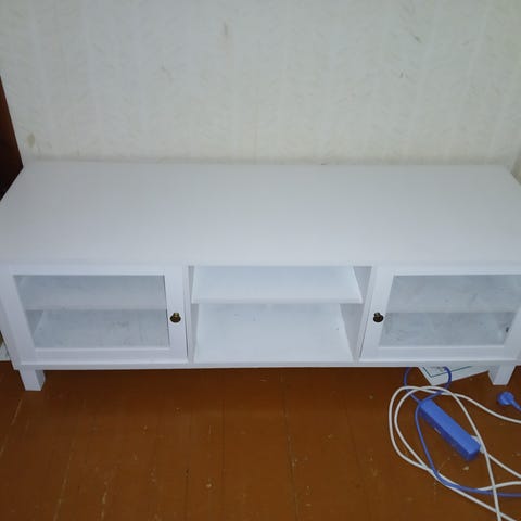 Myydään muuton yhteydessä käytöstä poistunut vaalea TV-taso. Runko valkoista kalustelevyä, kannen pinta vaaleaa puujäljitelmää. Keskellä vetolaatikko, molemmilla laidoilla ovien takana 2 hyllyä säilytystä varten. Vasemman puoleisen ylähyllyn kohdalta takalevy on puhkaistu johtojen läpivientiä silmällä pitäen.