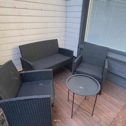 Hakusanat: taso, terassi, harmaa, huonekalu, huonekalut, puutarha, punottu, puutarhakalusteet, ulkokalusteet, sohva, pehmusteet, pöytä, käytetyt huonekalut, pöydät, sohvapöytä, ruokapöytä, nojatuoli, moderni