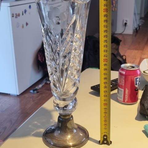 Kristallimaljakko, jossa on hopeinen jalka. Kokonaiskorkeus 21cm ja jalan Korkeus 4cm. Jalassa on kaiverrus ks. kuva