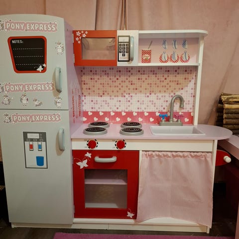 Lasten iso leikkikeittiö runsaalla määrällä oheistavaraa. Keittiön etureunassa pientä kulumaa, näkyy kuvissa. Napit ovat väännettäviä ja liesitasoon syttyy valot, sekä kuuluu ääni.