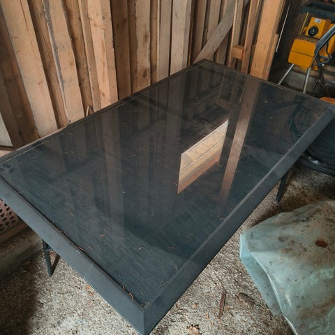Pyöreä lasikantinen pöytä mustalla metallijalalla. Pöydässä on tumma, todennäköisesti karkaistusta lasista valmistettu kansi ja kolmijalkainen metallirunko. Sopii esimerkiksi parvekkeelle, keittiöön tai pieneen ruokailutilaan. Ollut sisäkäytössä vuosi sitten ostettu. Nouto virenoja