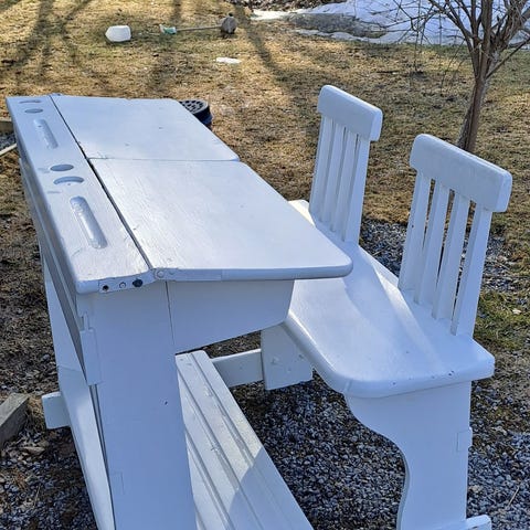 valkoinen säilytyspenkki ”liukumäellä”