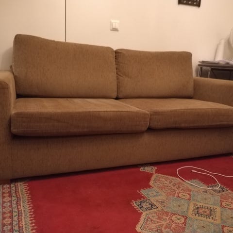 Annetaan sohva jossa harmaat nahkaiset istuinosat ja käsinojat ja pinkki-harmaaraidallinen runkoverhoilu. Hyvä istua ja ehjä mutta nahassa pintanaarmuja. Korkeus 80 cm, leveys 150 cm, syvyys leveimmillään n. 90 cm. Vain nouto hissittömän talon 2. kerroksesta ja omat kantajat tarvitaan.