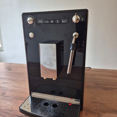 Uuden tieltä pari vuotta vanha Melitta Barista t smart kahviautomaatti. Laitteessa on integroidut kahvipapujen säiliö ja jauhatusjärjestelmä, jonka ansiosta kahvi valmistetaan suoraan pavuista. Etupaneelissa on kosketuspainikkeet eri kahvijuomavaihtoehdoille. Runko on mustaa ja ruostumattoman teräksen väristä materiaalia. Soveltuu erilaisten espressopohjaisten juomien ja suodatinkahvia muistuttavien juomien valmistukseen kotikäytössä.