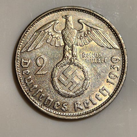 Natsikolikko 2 reichsmark kolikko 1938A, hopeaa