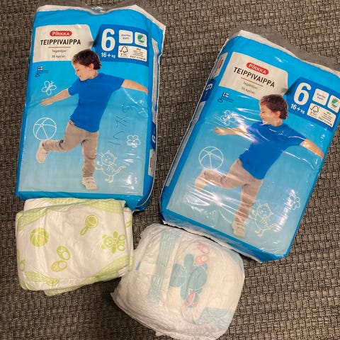 10kpl kuivapintaisia taskuvaippoja. Käytetty laiskasti osakestoillessa yhdellä lapsella. Sopii parhaiten kapeajalkaiselle. Ehjät, tahrattomat ja vesitestin läpäisevät. Ainoa miinus uuteen verrattuna on hieman harmaantuneet tarrat. Hajusteeton pesu.