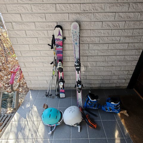 Lasten sukset ja sauvat. Suksissa on värikäs kuosi ja niissä on siteet valmiina. Pohjat ovat mustat. Sauvoissa on valkoiset varret ja kuviolliset yksityiskohdat. Sopivat lapselle alppihiihtoon rinteessä.