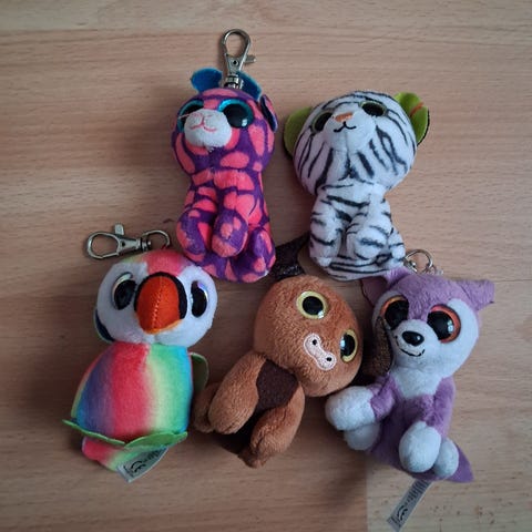 Ty Beanie Balls sarjan Heather kissa pehmolelu ja Ty Teeny Puffies Rainbow villakoira ja Ty Puffies Harmonie yksisarvinen. Nämä ovat pehmeitä, pallonmuotoisia pehmoleluja. Niillä on painoitettu pohja, jonka vuoksi ne ne laskeutuvat aina jaloilleen heitettäessä