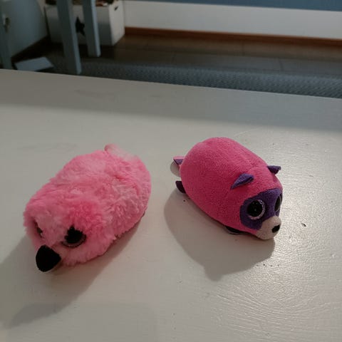 Ovat olleet leikeissä, nyt pesty koneessa, turkit kaipaavat harjausta, tuotelaput leikattu useimmista pois