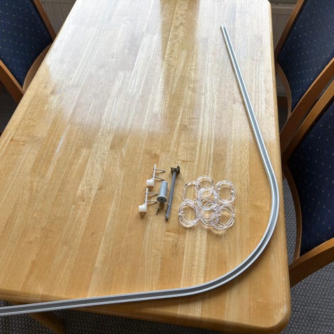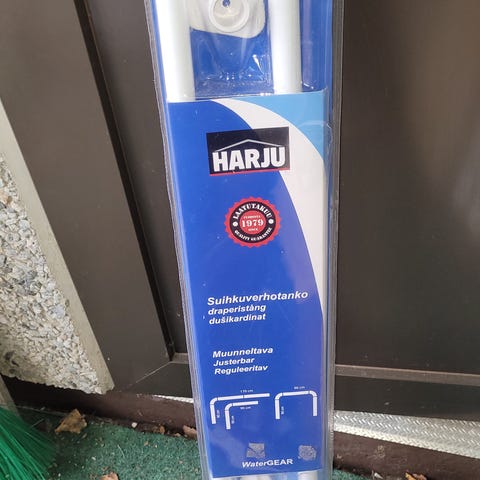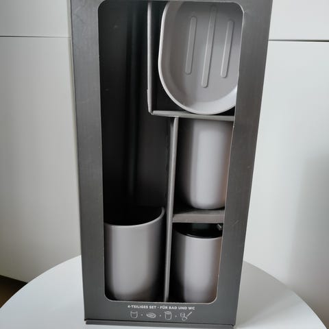 Myydään uusi kylpyhuone/WC setti, joka sisältää muovisen korin, suihkuverhon ja siihen 12 rinkulaa sekä kylpyhuone/WC maton. Väriltään musta / valkoinen.