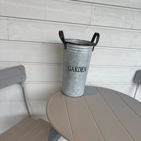 Metallikori, kolme sinkkiruukkua korissa, kolme pajupalloa.