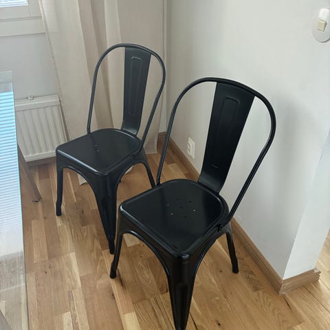 Maskusta ostetut ruokapöydän tuolit 4kpl. Väri tumman harmaa ja mustat metalliset tuolin jalat. Helppo purkaa ja kasata (alkuperänen työkalu löytyy). Jalat saa irrotettua joten helppo myös kuljettaa.