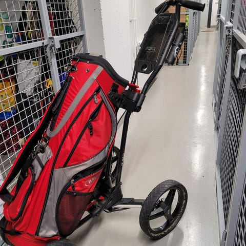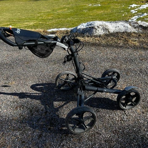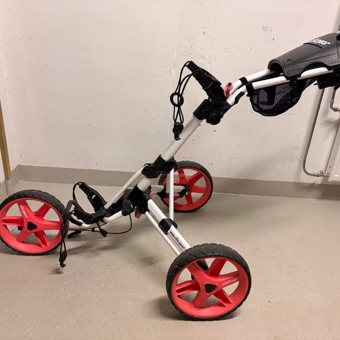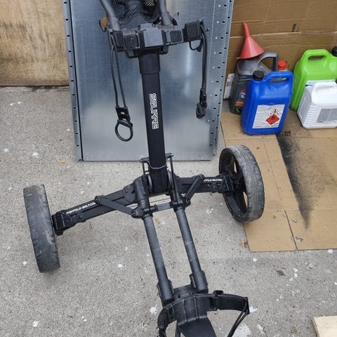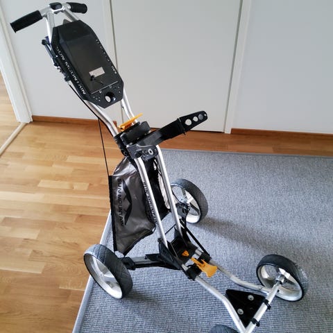 Laadukas 3 pyöräinen golfkärry, minkä saa taitettua litteäksi kuljettamisen helpottamiseksi. On ollut käyttämättömänä ja otettu ulos ainoastaan kuvan ottamista varten.