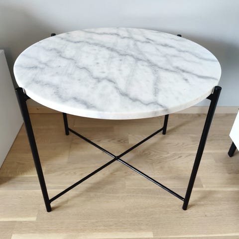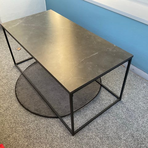 Jyskin betoninvärinen sohvapöytä. Itse päällystetty mustalla marmorikuviolla, voi halutessaan ottaa pois jos ei tykkää. Yhden kulman päällystys ottanut vähän osumaa. Korkeus 45cm x60x60
