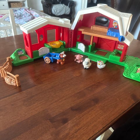 Fisher-Price maatilalelusetti, johon kuuluu muovinen punakeltainen navetta ja vihreä alusta sekä erivärisiä rakennuspalikoita. Navetta avautuu leikkiä varten ja sulkeutuu kantolaukuksi, jossa on kantokahva. Rakennuspalikat ovat suurikokoisia ja sopivat pienten lasten käteen. Settiä voi käyttää maatilateemaisiin leikkeihin ja rakenteluun sisätiloissa.