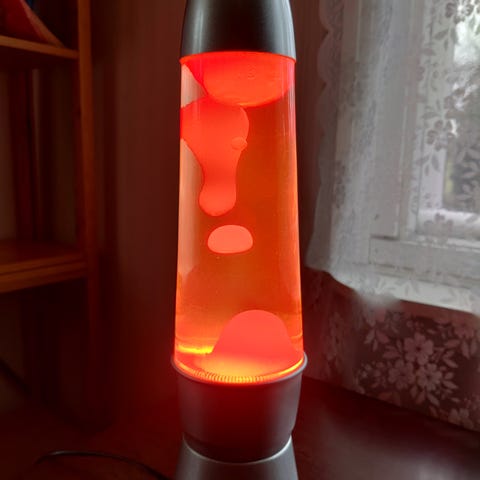 Retro laavalamppu, ostettu 90-luvun alussa. Kirkas neste, vaha huoneenlämmössä vaaleansininen, lämmetessään tummansininen/violetti. Korkeus n. 45cm. Lamppu 40W, A15, 220~240V.