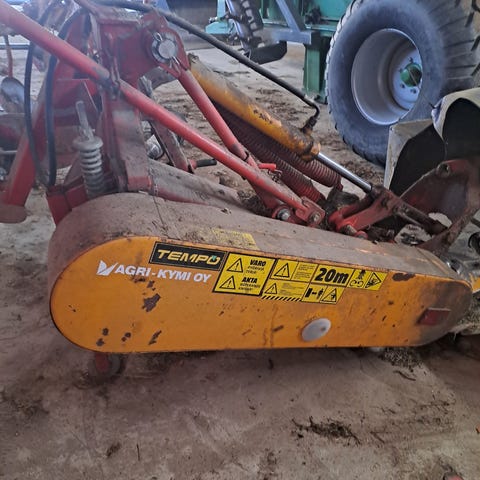 Tempo KRG 3,6-kultivaattori, vm. 1999, työleveys 3,6 metriä, 11 jousitettua piikkiä kahdessa rivissä, 38 cm leveät hanhenjalka-tyyppiset kärjet. Piikkiväli 64 cm, akseliväli 76 cm. Jälkiäkeessä 18 lovettua lautasta (44 cm), päädyissä sileät lautaset (35 cm), akselit säädettävissä neljään eri asentoon. Kannatuspyörät 6.00 x 16, paino 920 kg. Mukaan 9 kierteistä kärkeä ja 11 suoraa kärkeä. Hinta sisältää ALV 25,5 %.