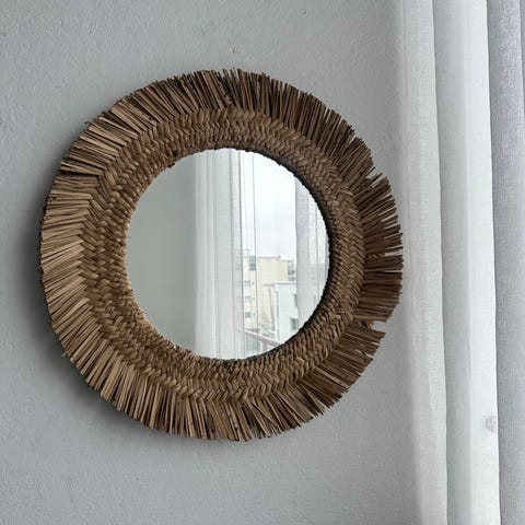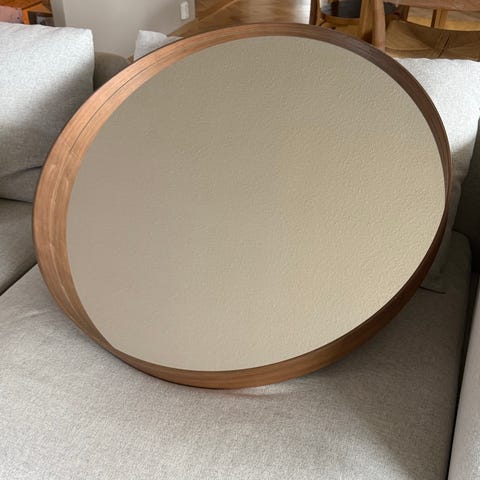 IKEA pyöreä peili, jossa vaalea puureunus. Peili sopii seinälle ripustettavaksi esimerkiksi eteiseen, makuuhuoneeseen tai olohuoneeseen. Taustapuolella kiinnityskohtia seinäkiinnitystä varten. Neutraali muotoilu sopii monenlaiseen sisustukseen.
