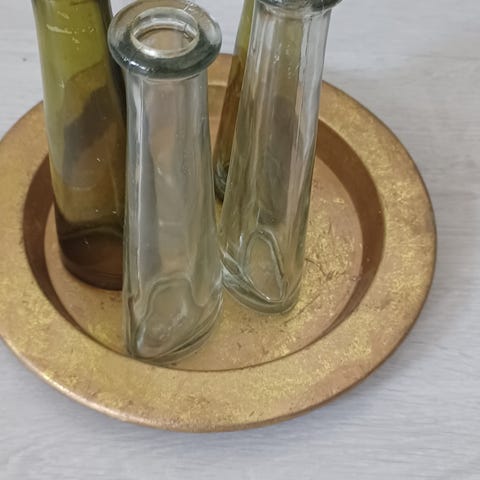 3, 4 ja 6 kulmaiset pullot. Mukana on myös koristeellinen lasikarahvi, jossa on kahva ja sinisävyinen kuviointi.